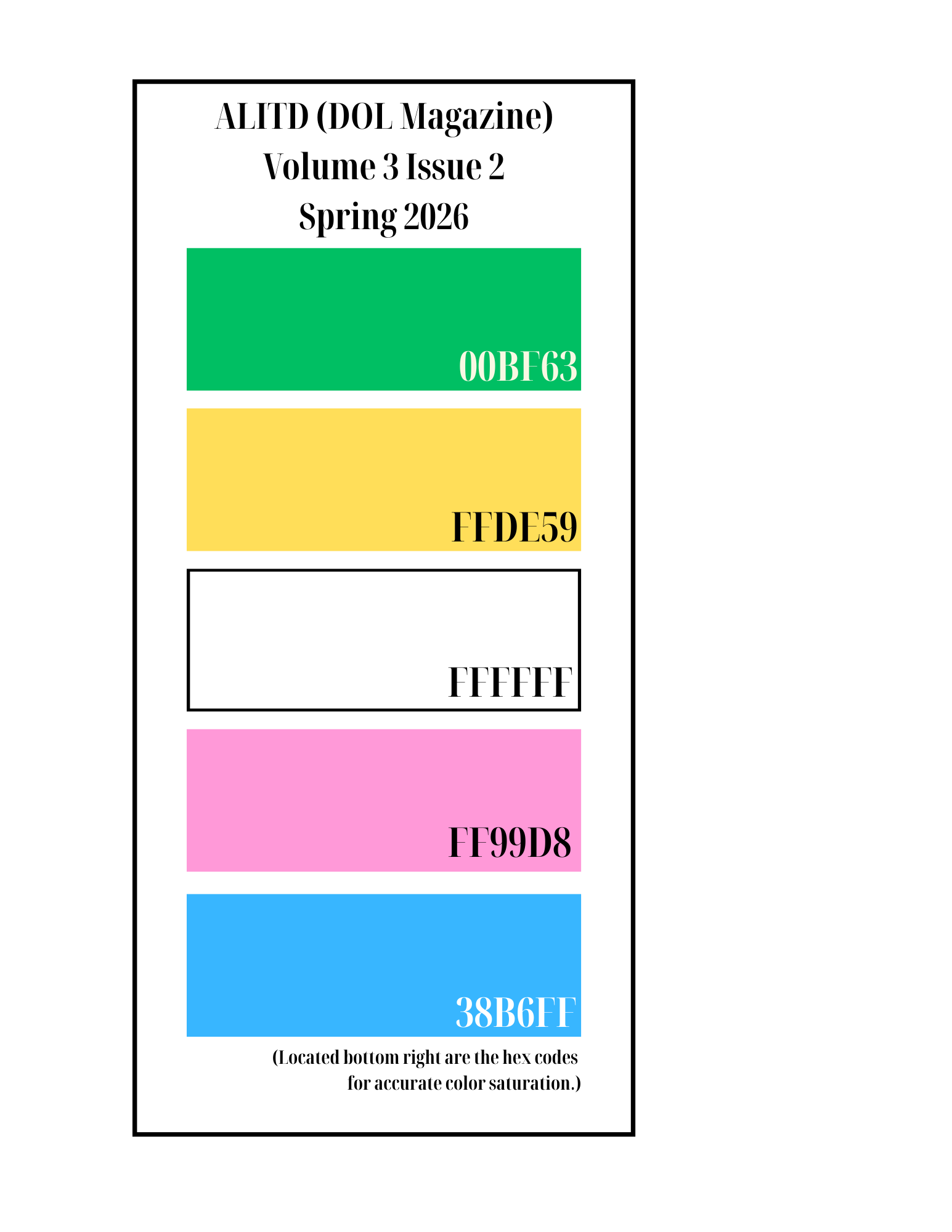 This is the color palette for the Spring 2026 issue. Please include these colors in your artwork/pictures (except for pencil sketches).
